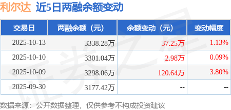 证券之星消息,10月13日,利尔达(920249)融资买入144.89万元,融资偿还107.64万元,融资净买入37.25万元,融资余额3338.28万元,近3个交易日已连续净买入累计160.86万元。