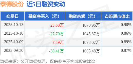 证券之星消息,10月13日,泰德股份(920378)融资买入68.41万元,融资偿还42.81万元,融资净买入25.6万元,融资余额1070.96万元。
