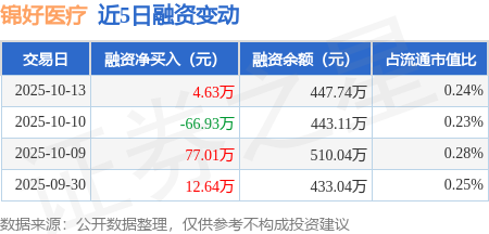 证券之星消息,10月13日,锦好医疗(920925)融资买入38.01万元,融资偿还33.38万元,融资净买入4.63万元,融资余额447.74万元。