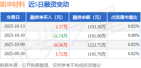证券之星消息,10月13日,凯华材料(920526)融资买入36.65万元,融资偿还34.28万元,融资净买入2.37万元,融资余额1193.38万元。