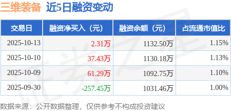 证券之星消息,10月13日,三维装备(920834)融资买入87.66万元,融资偿还85.35万元,融资净买入2.31万元,融资余额1132.5万元,近3个交易日已连续净买入累计101.04万元。