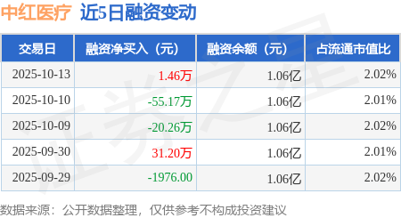 证券之星消息,10月13日,中红医疗(300981)融资买入732.28万元,融资偿还730.83万元,融资净买入1.46万元,融资余额1.06亿元。
