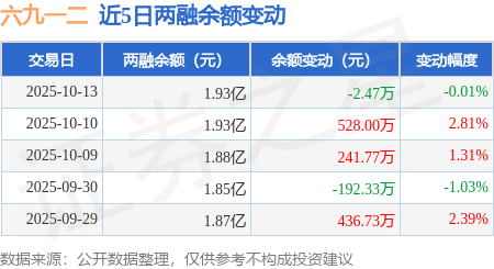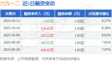 证券之星消息,10月13日,六九一二(301592)融资买入1100.87万元,融资偿还1104.7万元,融资净卖出3.83万元,融资余额1.93亿元。