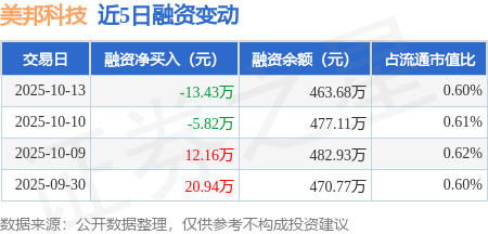 证券之星消息,10月13日,美邦科技(920471)融资买入21.25万元,融资偿还34.68万元,融资净卖出13.43万元,融资余额463.68万元。