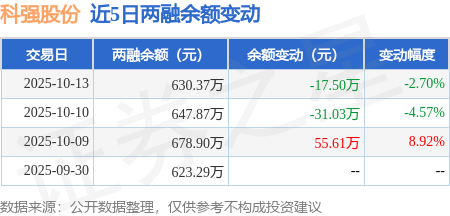 证券之星消息,10月13日,科强股份(920665)融资买入12.4万元,融资偿还29.9万元,融资净卖出17.5万元,融资余额630.37万元。