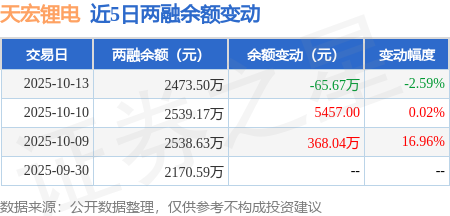 证券之星消息,10月13日,天宏锂电(920252)融资买入336.02万元,融资偿还401.69万元,融资净卖出65.67万元,融资余额2473.5万元。
