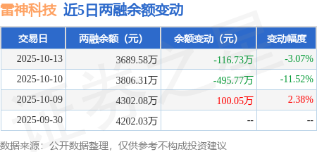 证券之星消息,10月13日,雷神科技(920190)融资买入241.71万元,融资偿还358.45万元,融资净卖出116.73万元,融资余额3689.58万元。