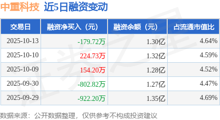 证券之星消息,10月13日,中重科技(603135)融资买入783.99万元,融资偿还963.7万元,融资净卖出179.72万元,融资余额1.3亿元。