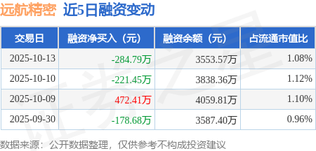 证券之星消息,10月13日,远航精密(920914)融资买入278.07万元,融资偿还562.86万元,融资净卖出284.79万元,融资余额3553.57万元。