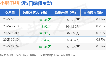 证券之星消息,10月13日,小熊电器(002959)融资买入723.3万元,融资偿还1109.64万元,融资净卖出386.34万元,融资余额5658.35万元。