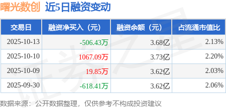 证券之星消息,10月13日,曙光数创(920808)融资买入1229.8万元,融资偿还1736.23万元,融资净卖出506.43万元,融资余额3.68亿元。