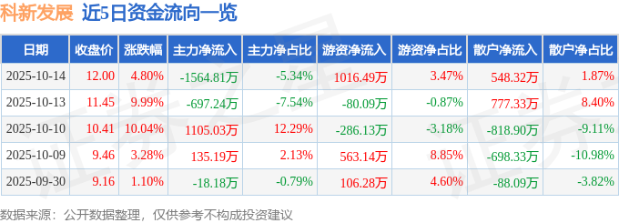 证券之星消息,截至2025年10月14日收盘,科新发展(600234)报收于12.0元,上涨4.8%,换手率9.37%,成交量24.6万手,成交额2.93亿元。