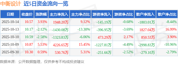 证券之星消息,截至2025年10月14日收盘,中衡设计(603017)报收于10.57元,上涨3.93%,换手率7.43%,成交量20.52万手,成交额2.14亿元。