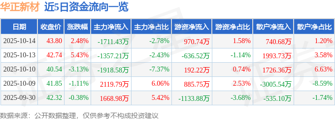 证券之星消息,截至2025年10月14日收盘,华正新材(603186)报收于43.8元,上涨2.48%,换手率9.76%,成交量13.86万手,成交额6.15亿元。