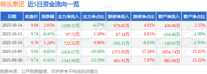 证券之星消息,截至2025年10月14日收盘,锦泓集团(603518)报收于9.94元,上涨2.05%,换手率4.94%,成交量17.03万手,成交额1.69亿元。