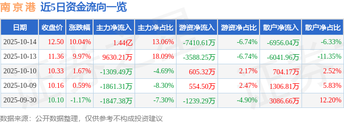证券之星消息,截至2025年10月14日收盘,南 京 港(002040)报收于12.5元,上涨10.04%,已连续涨停2天,换手率18.81%,成交量91.4万手,成交额11.0亿元。