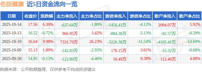 证券之星消息,截至2025年10月14日收盘,名臣健康(002919)报收于17.56元,上涨6.3%,换手率7.65%,成交量20.21万手,成交额3.54亿元。