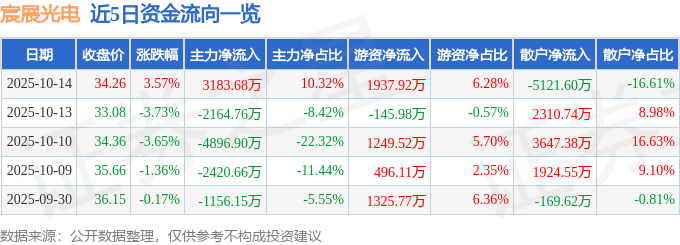 证券之星消息,截至2025年10月14日收盘,宸展光电(003019)报收于34.26元,上涨3.57%,换手率5.33%,成交量9.11万手,成交额3.08亿元。