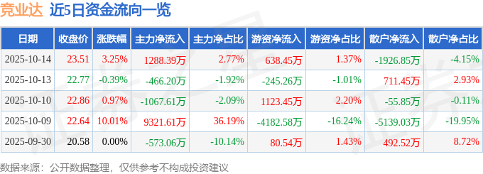 证券之星消息,截至2025年10月14日收盘,竞业达(003005)报收于23.51元,上涨3.25%,换手率15.73%,成交量19.98万手,成交额4.64亿元。