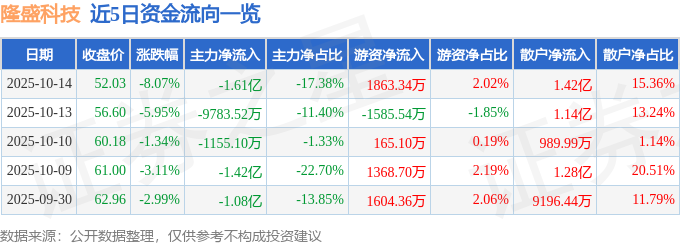 证券之星消息,截至2025年10月14日收盘,隆盛科技(300680)报收于52.03元,下跌8.07%,换手率9.71%,成交量17.07万手,成交额9.24亿元。