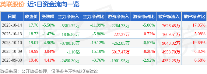 证券之星消息,截至2025年10月14日收盘,英联股份(002846)报收于17.7元,下跌5.5%,换手率9.71%,成交量24.97万手,成交额4.47亿元。