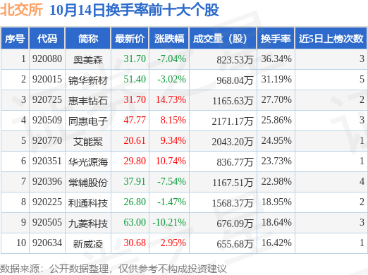 当日北交所换手率前10大个股中5只个股收涨,平均涨幅9.18%,其中奥美森(920080)以换手率36.34%排第一,7只个股近5个交易日中多次上榜。