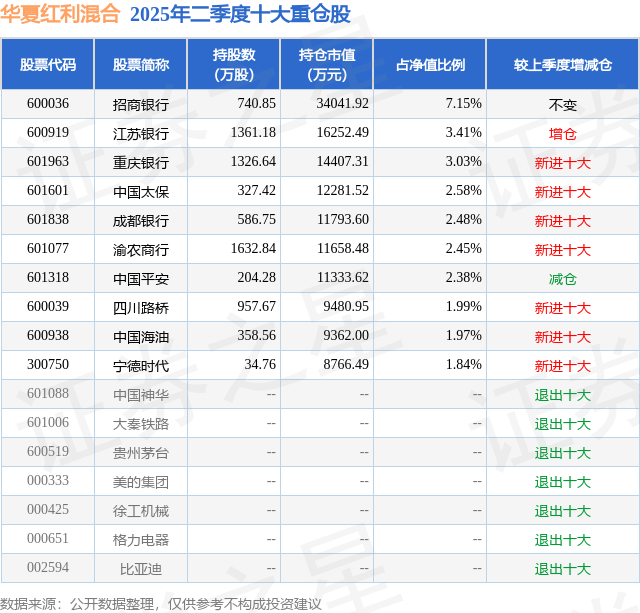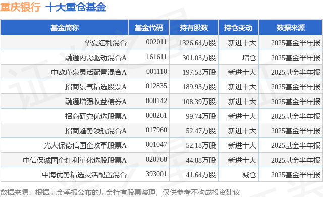 根据2025基金半年报公募基金重仓股数据,重仓该股的公募基金共19家,其中持有数量最多的公募基金为华夏基金的华夏红利混合。华夏红利混合目前规模为47.62亿元,最新净值2.528(10月13日),较上一交易日下跌0.12%,近一年上涨6.53%。该公募基金现任基金经理为林晶。林晶在任的基金产品包括:华夏核心资产混合A,管理时间为2021年1月28日至今,期间收益率为-31.8%;华夏收入混合,管理时间为2025年6月25日至今,期间收益率为11.35%。