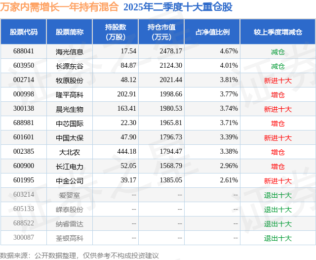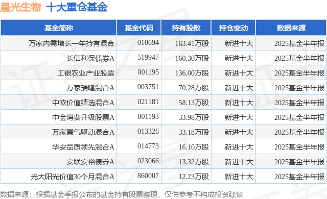 重仓晨光生物的前十大公募基金请见下表: