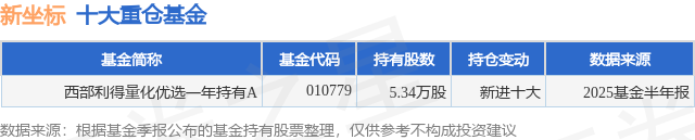 根据2025基金半年报公募基金重仓股数据,重仓该股的公募基金共1家,其中持有数量最多的公募基金为西部利得基金的西部利得量化优选一年持有A。西部利得量化优选一年持有A目前规模为2.27亿元,最新净值1.2(10月13日),较上一交易日下跌0.56%,近一年上涨61.0%。该公募基金现任基金经理为翟梓舰。翟梓舰在任的基金产品包括:西部利得中证1000指数增强A,管理时间为2023年10月21日至今,期间收益率为40.31%;西部利得人工智能主题指数增强A,管理时间为2024年11月30日至今,期间收益率为57.17%。