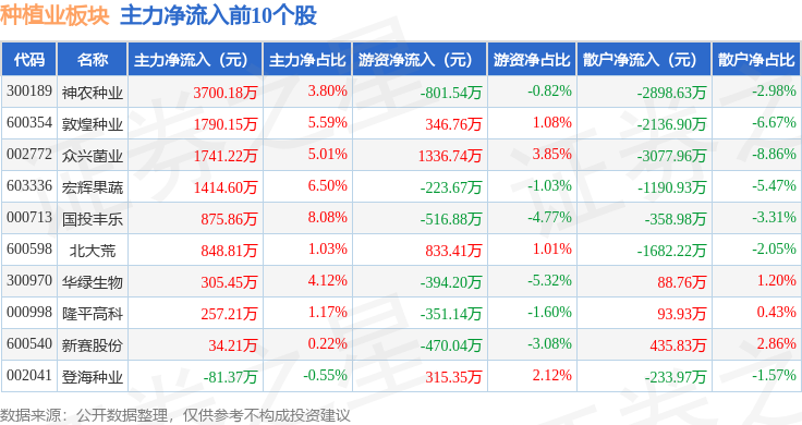 从资金流向上来看,当日种植业板块主力资金净流出5407.23万元,游资资金净流入4570.49万元,散户资金净流入836.74万元。种植业板块个股资金流向见下表:
