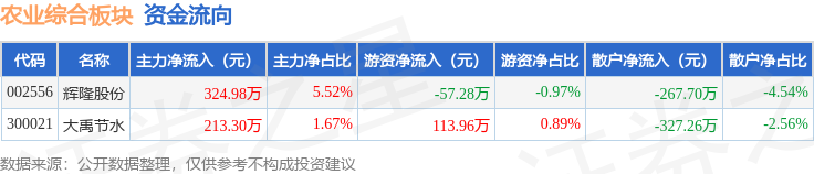 从资金流向上来看,当日农业综合板块主力资金净流入538.28万元,游资资金净流入56.69万元,散户资金净流出594.96万元。农业综合板块个股资金流向见下表: