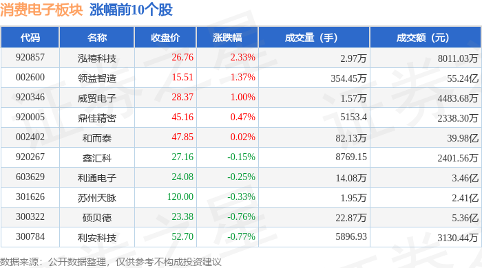 证券之星消息,10月14日消费电子板块较上一交易日下跌4.82%,统联精密领跌。当日上证指数报收于3865.23,下跌0.62%。深证成指报收于12895.11,下跌2.54%。消费电子板块个股涨跌见下表: