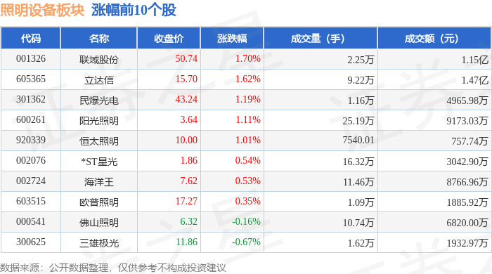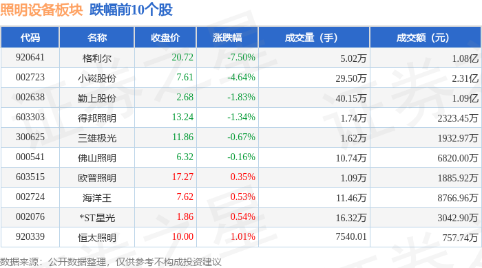 证券之星消息,10月14日照明设备板块较上一交易日下跌0.01%,格利尔领跌。当日上证指数报收于3865.23,下跌0.62%。深证成指报收于12895.11,下跌2.54%。照明设备板块个股涨跌见下表: