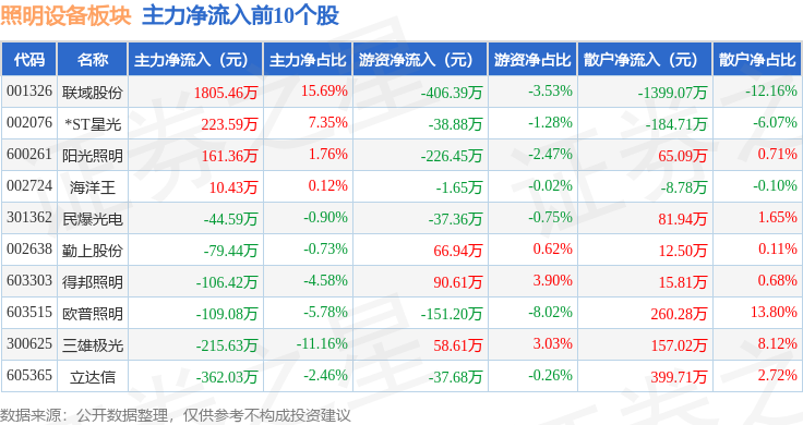 从资金流向上来看,当日照明设备板块主力资金净流出5754.02万元,游资资金净流入172.23万元,散户资金净流入5581.79万元。照明设备板块个股资金流向见下表: