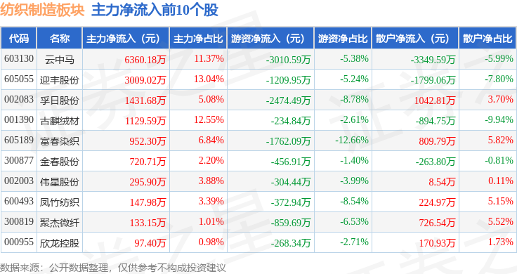 从资金流向上来看,当日纺织制造板块主力资金净流出7901.56万元,游资资金净流出6507.87万元,散户资金净流入1.44亿元。纺织制造板块个股资金流向见下表:
