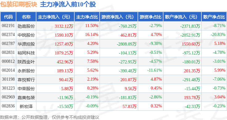 从资金流向上来看,当日包装印刷板块主力资金净流出5.34亿元,游资资金净流出1.34亿元,散户资金净流入6.67亿元。包装印刷板块个股资金流向见下表: