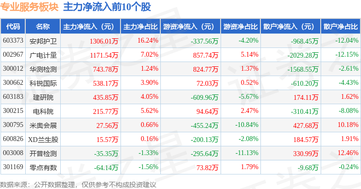 从资金流向上来看,当日专业服务板块主力资金净流出2.11亿元,游资资金净流入3161.4万元,散户资金净流入1.79亿元。专业服务板块个股资金流向见下表: