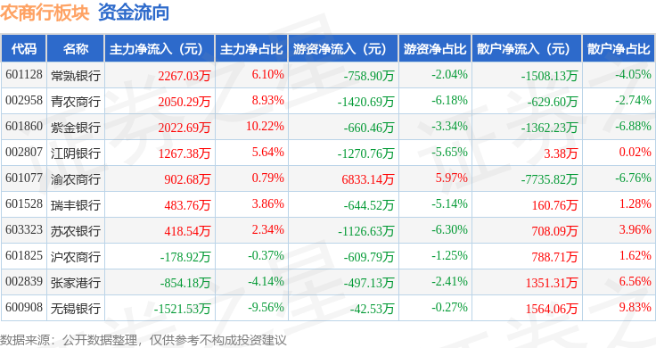 从资金流向上来看,当日农商行板块主力资金净流入6857.74万元,游资资金净流出198.27万元,散户资金净流出6659.47万元。农商行板块个股资金流向见下表: