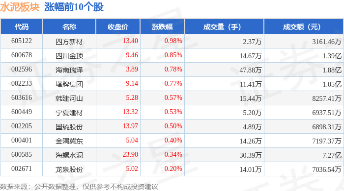 从资金流向上来看,当日水泥板块主力资金净流出1.17亿元,游资资金净流出1.46亿元,散户资金净流入2.63亿元。水泥板块个股资金流向见下表: