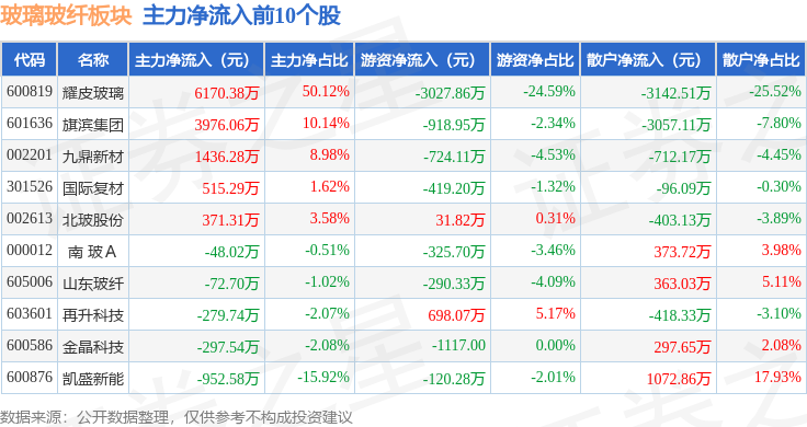 从资金流向上来看,当日玻璃玻纤板块主力资金净流出4.37亿元,游资资金净流出1446.56万元,散户资金净流入4.52亿元。玻璃玻纤板块个股资金流向见下表: