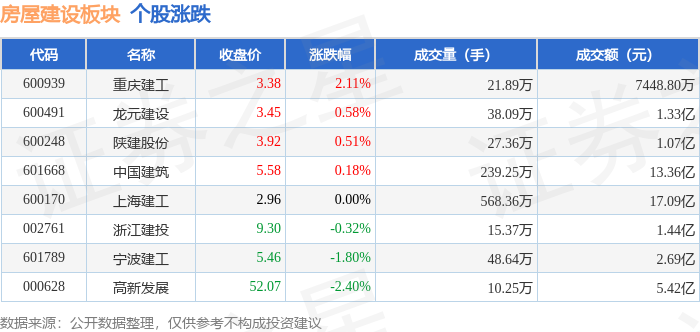 证券之星消息,10月14日房屋建设板块较上一交易日上涨0.09%,重庆建工领涨。当日上证指数报收于3865.23,下跌0.62%。深证成指报收于12895.11,下跌2.54%。房屋建设板块个股涨跌见下表: