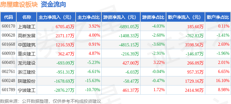 从资金流向上来看,当日房屋建设板块主力资金净流入4256.3万元,游资资金净流出1.25亿元,散户资金净流入8242.75万元。房屋建设板块个股资金流向见下表: