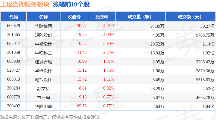 证券之星消息,10月14日工程咨询服务板块较上一交易日上涨0.0%,华建集团领涨。当日上证指数报收于3865.23,下跌0.62%。深证成指报收于12895.11,下跌2.54%。工程咨询服务板块个股涨跌见下表: