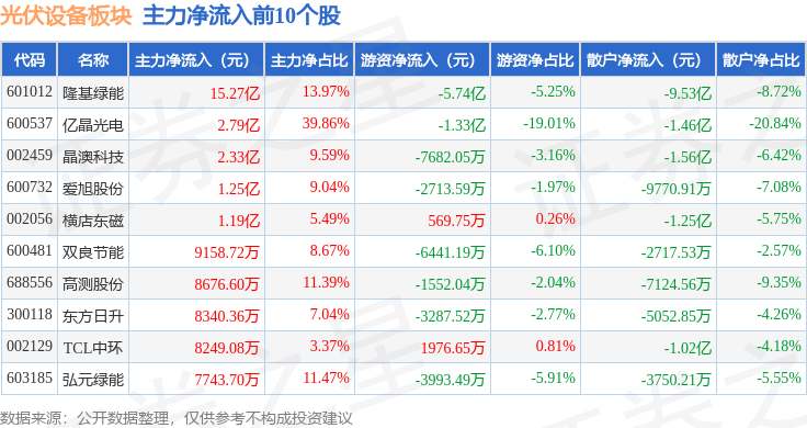 从资金流向上来看,当日光伏设备板块主力资金净流入18.25亿元,游资资金净流出7.15亿元,散户资金净流出11.11亿元。光伏设备板块个股资金流向见下表: