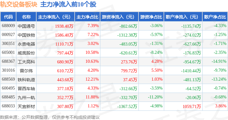 从资金流向上来看,当日轨交设备板块主力资金净流出1.23亿元,游资资金净流入7191.49万元,散户资金净流入5153.33万元。轨交设备板块个股资金流向见下表: