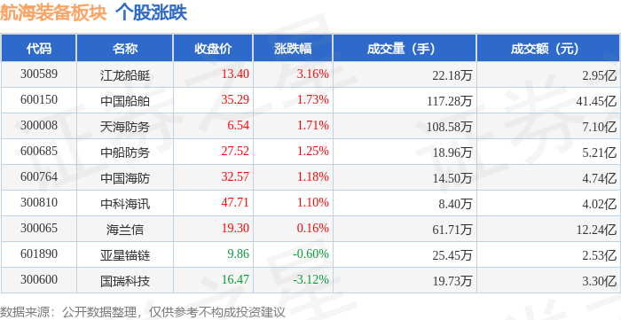 证券之星消息,10月14日航海装备板块较上一交易日上涨1.48%,江龙船艇领涨。当日上证指数报收于3865.23,下跌0.62%。深证成指报收于12895.11,下跌2.54%。航海装备板块个股涨跌见下表: