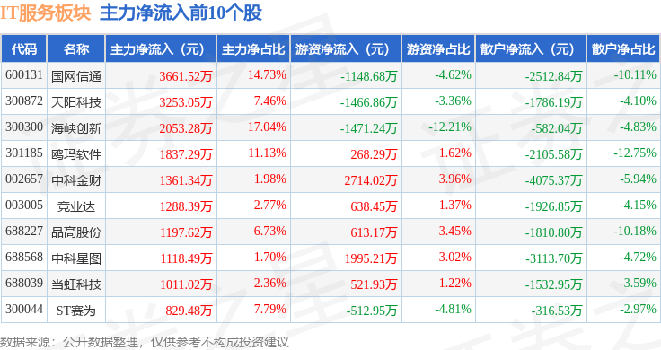 从资金流向上来看,当日IT服务板块主力资金净流出47.62亿元,游资资金净流入14.75亿元,散户资金净流入32.87亿元。IT服务板块个股资金流向见下表: