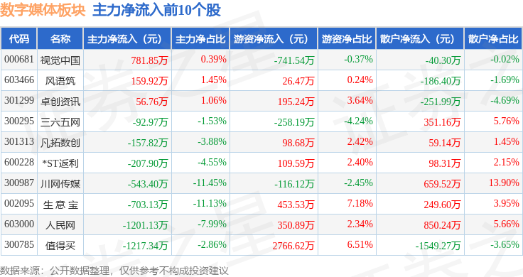 从资金流向上来看,当日数字媒体板块主力资金净流出1.68亿元,游资资金净流入4386.99万元,散户资金净流入1.24亿元。数字媒体板块个股资金流向见下表: