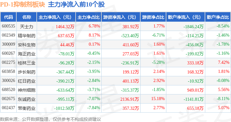 从资金流向上来看,当日PD-1抑制剂板块主力资金净流出17.47亿元,游资资金净流入4.64亿元,散户资金净流入12.83亿元。PD-1抑制剂板块个股资金流向见下表: