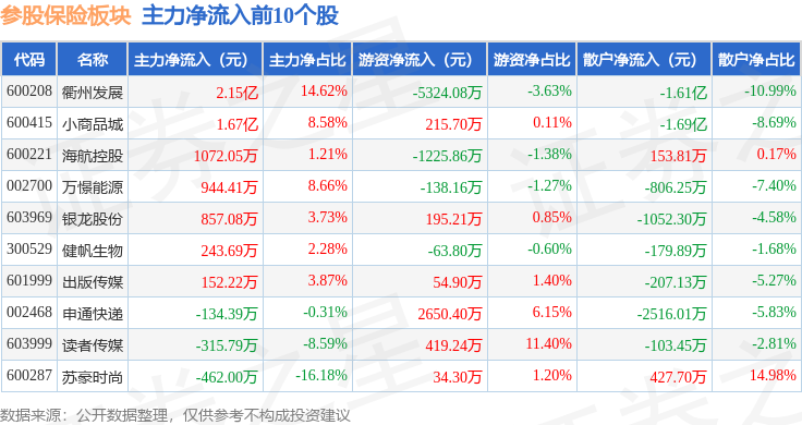 从资金流向上来看,当日参股保险板块主力资金净流出3.89亿元,游资资金净流入2.41亿元,散户资金净流入1.48亿元。参股保险板块个股资金流向见下表: